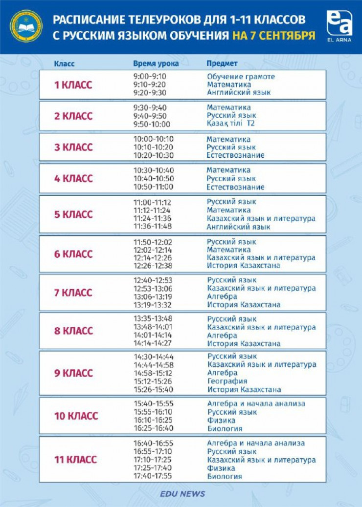 Телеуроки для учащихся 1-11 классов покажут на телеканале "Ел Арна" с 09.00 до 17.55.