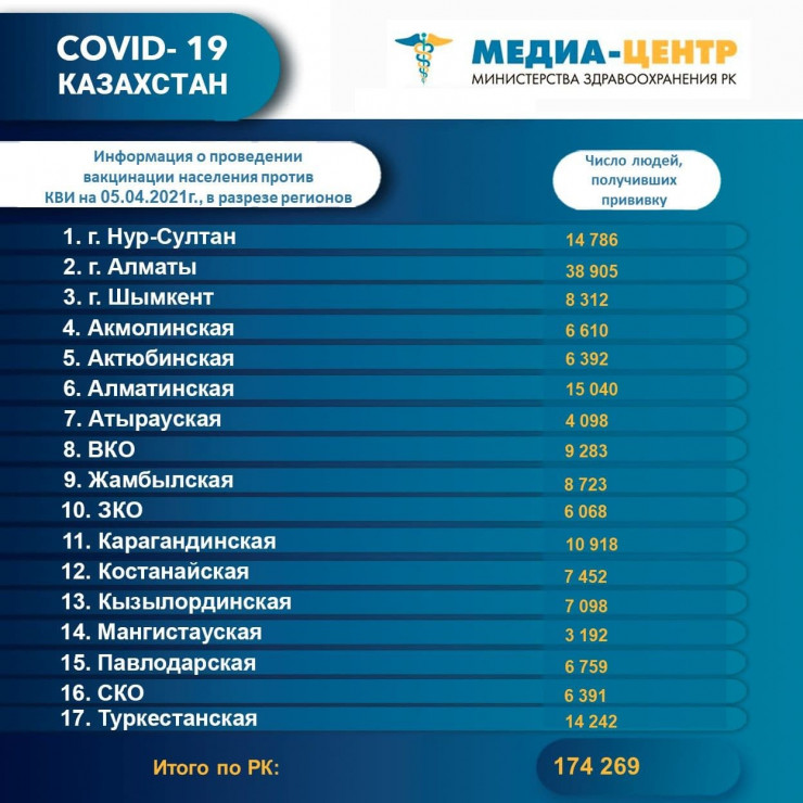 Всего в Казахстане, по данным на 5 апреля, вакцинацию прошли 174 269 человек.