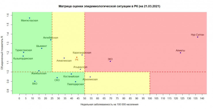 Матрица оценки эпидемиологической ситуации в регионах на 21 марта выглядит следующим образом: