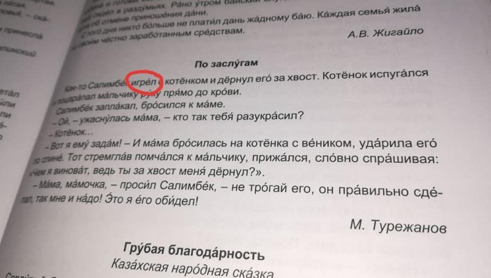 Фотографии страниц книги опубликовала в Facebook астанчанка. Она обращает внимание на ошибку в слове "играл": в книге написано "игрел".