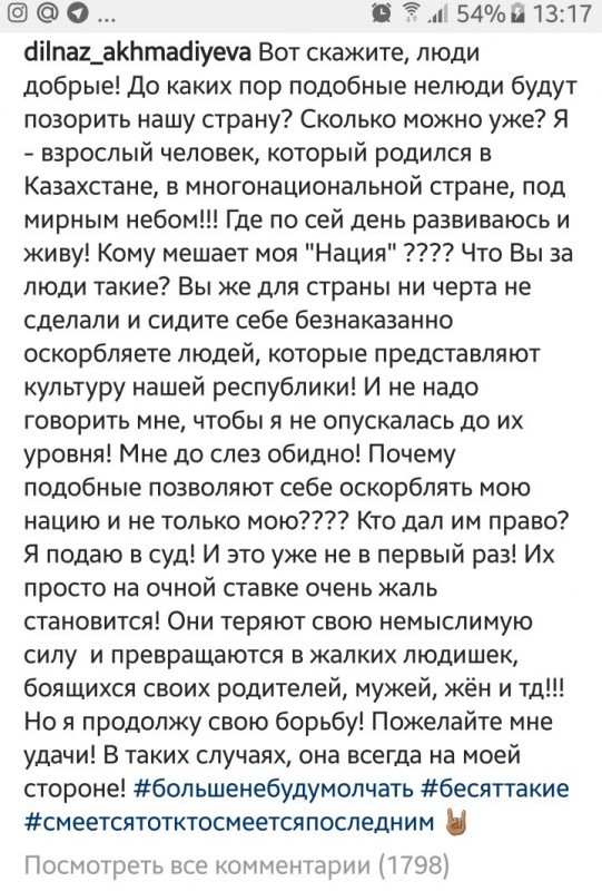 "Вот скажите, люди добрые! До каких пор подобные нелюди будут позорить нашу страну? Сколько можно уже? Я - взрослый человек, который родился в Казахстане, в многонациональной стране, под мирным небом!!! Где по сей день развиваюсь и живу! Кому мешает моя "Нация" ???? Что Вы за люди такие? Вы же для страны ни черта не сделали и сидите себе безнаказанно оскорбляете людей, которые представляют культуру нашей республики! И не надо говорить мне, чтобы я не опускалась до их уровня! Мне до слез обидно! Почему подобные позволяют себе оскорблять мою нацию и не только мою???? Кто дал им право? Я подаю в суд! И это уже не в первый раз! Их просто на очной ставке очень жаль становится! Они теряют свою немыслимую силу и превращаются в жалких людишек, боящихся своих родителей, мужей, жён и тд!!! Но я продолжу свою борьбу! Пожелайте мне удачи! В таких случаях, она всегда на моей стороне!", - написала Ахмадиева (орфография и пунктуация сохранена - прим. ред.)