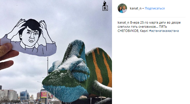 Художник Канат Нуртазин (kanat_n) использовал мем с Джеки Чаном, чтобы выразить свое отношение к весне в столице.