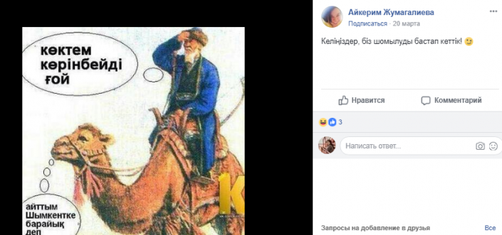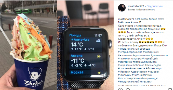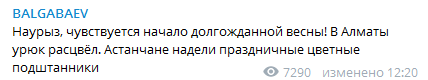 "Наурыз, чувствуется начало долгожданной весны! В Алматы урюк расцвел. Астанчане надели праздничные цветные подштанники".