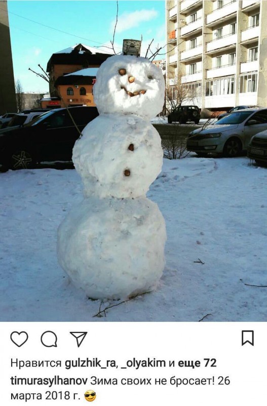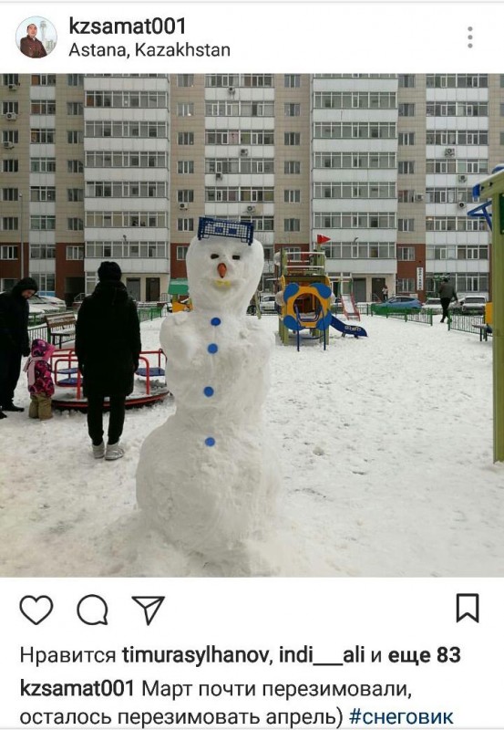 Житель столицы Тимур Асылханов также высказался о снеговиках в марте: "Зима своих не бросает".