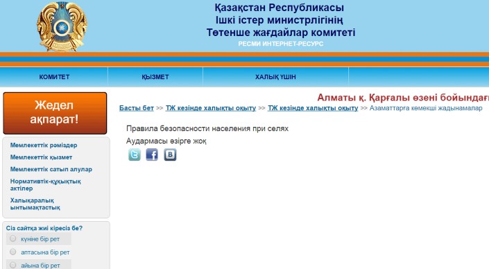 На сайте Комитета по чрезвычайным ситуациям есть памятка "Правила безопасности населения при селях" ("Сел қаупі жайында тұрғындарға ақпарат") на казахском языке. Однако, пройдя по указанной ссылке, на сайте появляется надпись "Пока нет перевода" ("Аудармасы әзірге жоқ"). Следом журналисты попытались найти информацию на сайте ДЧС Алматы. Там есть раздел "Жаднамалар халық үшін", название которого, как отмечает Massaget.kz, было переведено с русского слишком дословно и прямолинейно, с неверным порядком слов.