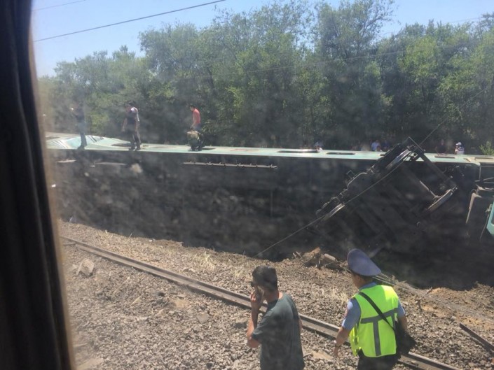 Напомним, ЧП произошло около 13.25 в районе станции Шу в Жамбылской области с поездом сообщением Астана - Алматы № 9 "Байтерек". По уточненной информации КЧС МВД, сошли с рельсов шесть вагонов, три из которых легли на бок. Пострадало четыре человека, один из которых погиб. Личности устанавливаются. В ДЧС Жамбылской области открыта горячая линия. Номера телефонов: (7262) 51-35-75, 51-41-67. В Министерстве по инвестициям и развитию назвали предварительную причину схода вагонов.