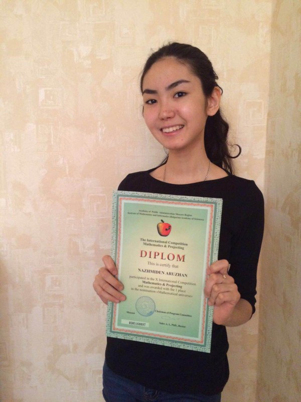 Павлодарка Аружан Нажмиден завоевала золотую медаль на международном научном конкурсе "Математика и проектирование" в номинации "Maтематическая вселенная". Десятиклассница павлодарского казахско-турецкого лицея представила на суд жюри научную работу по поиску формулы нахождения простого числа. Как рассказала девушка, работать над научным проектом она начала еще год назад.