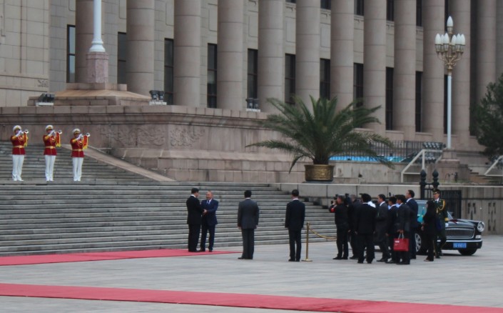 Председатель Китая Си Цзиньпин встретил его лично. По традиции сначала заиграл гимн Казахстана, который сопровождали пушечные залпы. Затем гимн Китая.