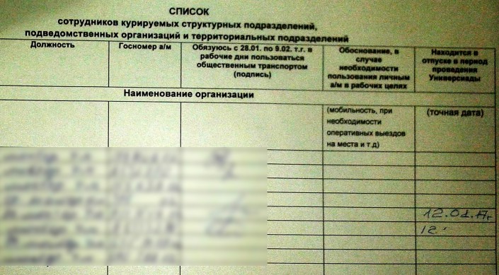 Ранее в социальных сетях появились фотографии документа, в котором указаны имена и фамилии, и есть графа "Обязуюсь с 28.01. по 9.02. текущего года в рабочие дни пользоваться общественным транспортом".