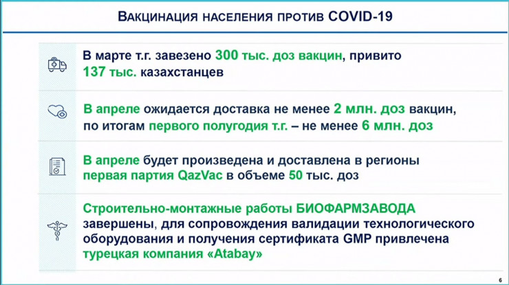 "В апреле будет произведена и доставлена в регионы первая партия отечественной вакцины QazVac в объеме 50 тысяч доз на базе института биологической безопасности", - сказал Тугжанов на совещании по эпидемиологической ситуации в стране с участием Президента 1 апреля.