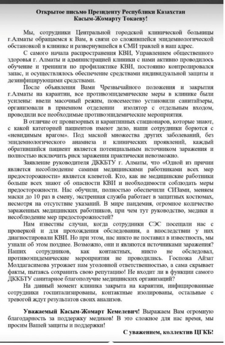 Обращение появилось в социальной сети Facebook 13 апреля. Авторы письма представляются сотрудниками Центральной городской клинической больницы Алматы.