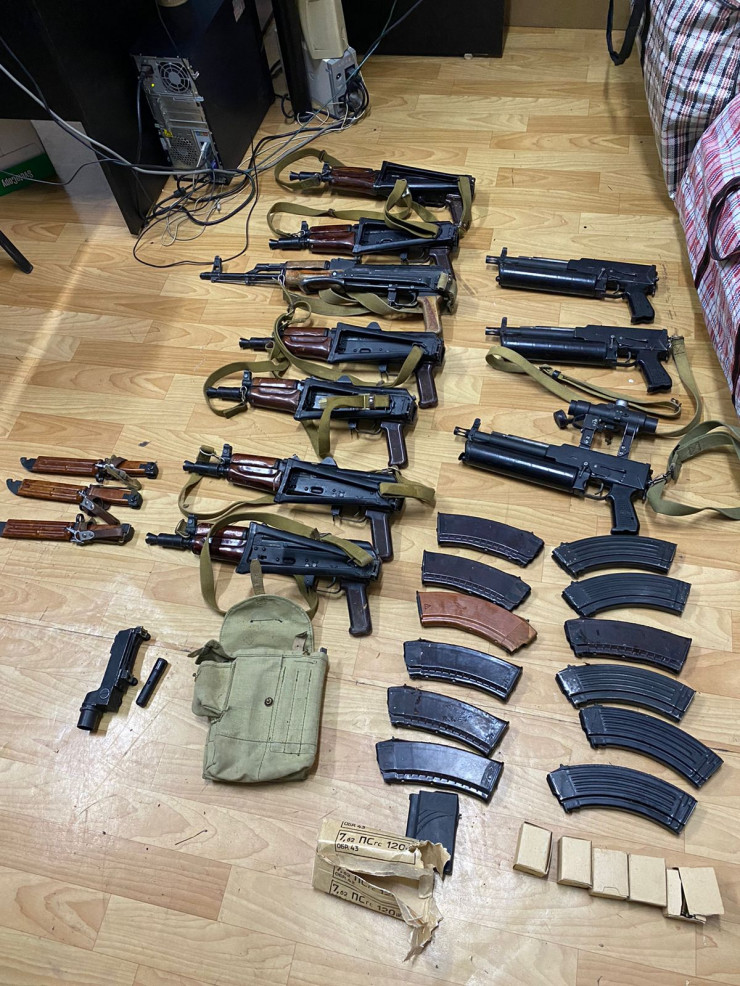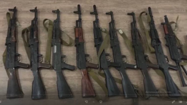 "Однозначно на фотографии боевое ручное стрелковое оружие, автоматы АКС-74У, один - просто АКС (автомат Калашникова складной образца 1974 года, укороченный) - стоит на вооружении армии, полиции, специальных и десантных подразделений. В гражданском обороте он запрещен, в оружейных магазинах его никогда не было и быть не могло. Три пистолета-пулемета ПП-90М1, российское производство, снизу большая черная труба, это не подствольный гранатомет, а такой магазин шнековый, пистолетный патрон калибра 9 миллиметров. Магазины к автоматам, штык-ножи также к автоматам", - объяснил исполнительный директор оружейной ассоциации "Корамсак" Сергей Катнов.