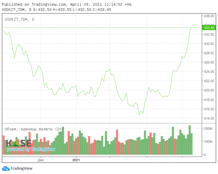 Напомним, тенге слабеет по отношению к доллару с 25 февраля, когда его стоимость была на уровне 415 за доллар. 8 апреля доллар закрыл торги на KASE на отметке 433 тенге, подорожав сразу на 2 тенге за сутки. В обменных пунктах Нур-Султана и Алматы максимальный курс продажи американской валюты составил 435 тенге. Утром 9 апреля курс доллара еще немного вырос