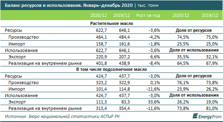 По итогам января – декабря 2020 года компании обеспечили спрос (реализация на внутреннем рынке плюс экспорт) на растительное масло на 74,5 процента. На долю импорта, соответственно, пришлось 25,5 процента: в страну завезли 158,7 тысячи тонн масла - на 1,8 процента меньше, чем годом ранее. На внутреннем рынке реализовали 401,8 тысячи тонн масла - на 8,4 процента меньше, чем в январе – декабре 2019 года.