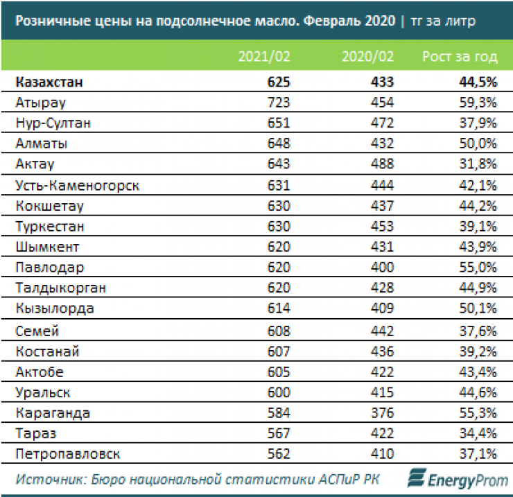 В феврале 2021 года на базарах и в магазинах страны литр подсолнечного масла продавали за 625 тенге, это на 44,5 процента дороже, чем годом ранее.