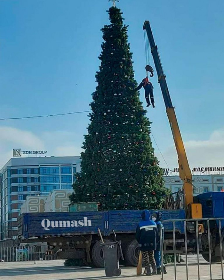 В Сети появилось фото, на котором запечатлен рабочий, подвешенный на стреле крана во время украшения главной городской елки на площади Исатая и Махамбета в Атырау, передает Tengrinews.kz.