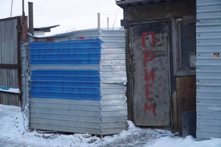 Во дворе пункта приема полицейские обнаружили загадочную деревянную будку, которая была заперта на замок. После просьбы сотрудников работник пункта достал ключи.