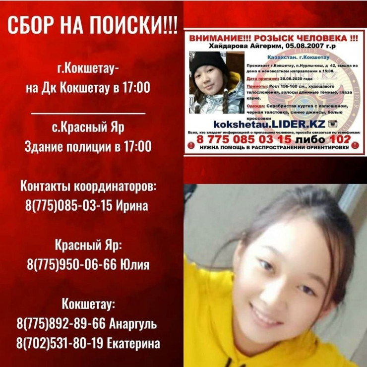 Всех, кто владеет хоть какой-то информацией об Айгерим, просят сообщить на номер 8 775 085 03 15 либо 102.