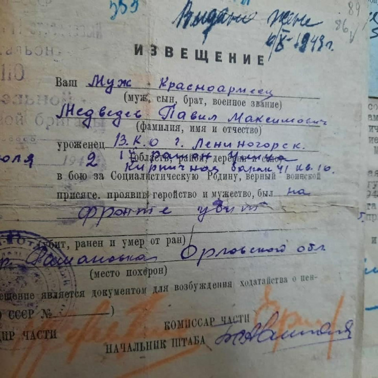 Российские поисковики совместно со специалистами лаборатории "Солдатский медальон" исследовали  бланк, проанализировали базу данных Мемориал, провели работу в Центральном архиве Министерства обороны РФ, изучили списки погибших и пропавших без вести по 110-й стрелковой бригаде в июле 1942 года. Написали десяток запросов в военкомат и поисковикам по месту призыва предполагаемого солдата. Ответ из военкомата Риддера подтвердил предположения, что фамилия найденного бойца - Медведев.