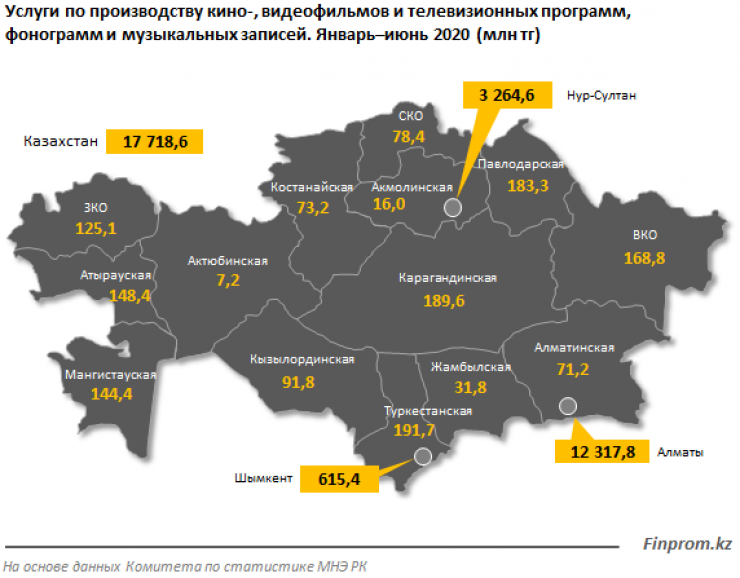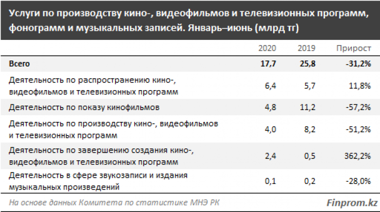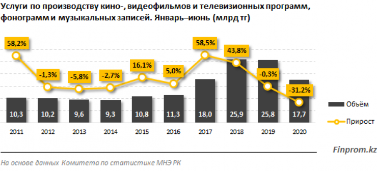 Услуги по показу кинофильмов ушли в минус в 2,3 раза, до 4,8 миллиарда тенге, что ожидаемо в периоды локдаунов.
