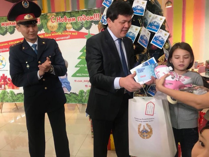 Начало праздничной акции, по его словам, положил министр внутренних дел Калмуханбет Касымов. От его имени новогодние сюрпризы удивили троих детей.