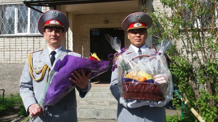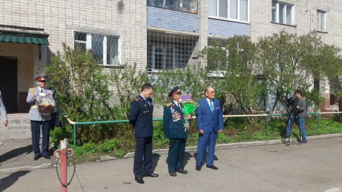 Услышав песни за окном, участник ВОВ Рахимов Курмат Рахимович, поспешил надеть свой парадный китель с медалями и выйти во двор. Ветеран был удивлен, хотя не скрывал, что ждал поздравление от своих бывших коллег.