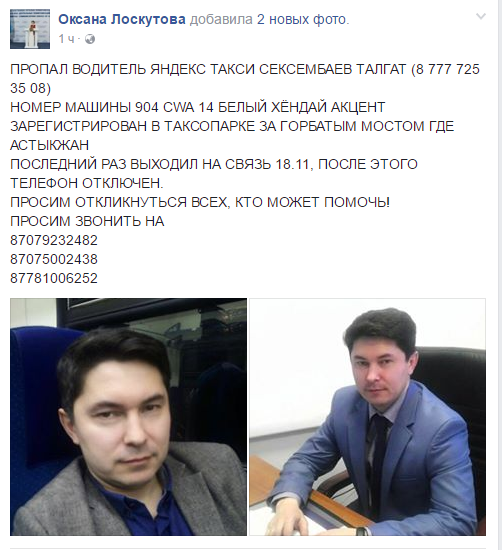 В Facebook появилась информация о пропаже Талгата Сексембаева, который занимается частным извозом.