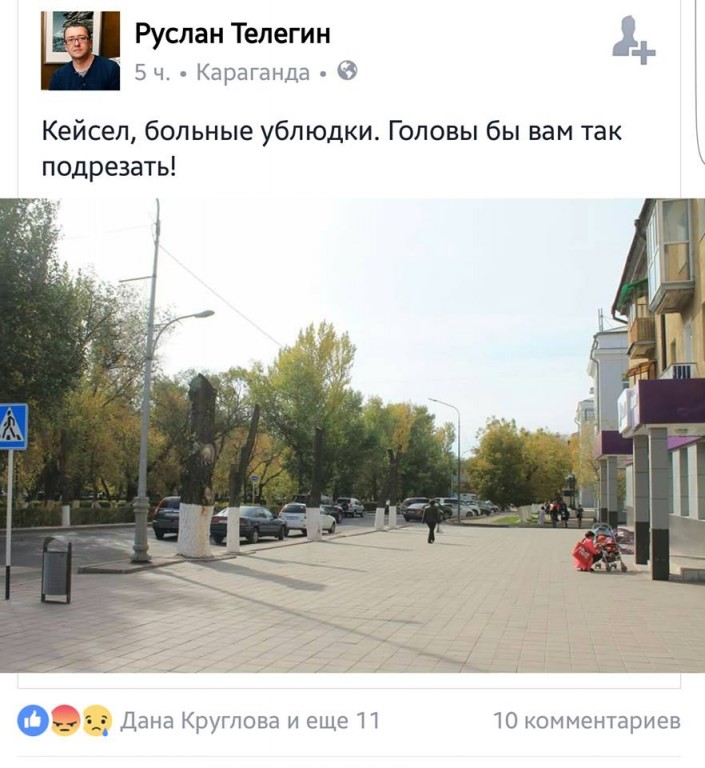 Поводом для обсуждения стал его пост на своей личной странице Facebook с нелестными выражениями в адрес сотового оператора. "Кейсел, больные ублюдки", - написал он к фотографии, где срублены деревья возле офиса компании Kcell. Чиновника сразу обсмеяли, отметив, что разрешение на вырубку деревьев дает акимат, и советник акима должен был этот момент уточнить. Пользователи пожаловались Департаменту по делам государственной службы на поведение госслужащего, посчитав его пост хамским. В Kcell подтвердили, что вырубку деревьев производила администрация города.