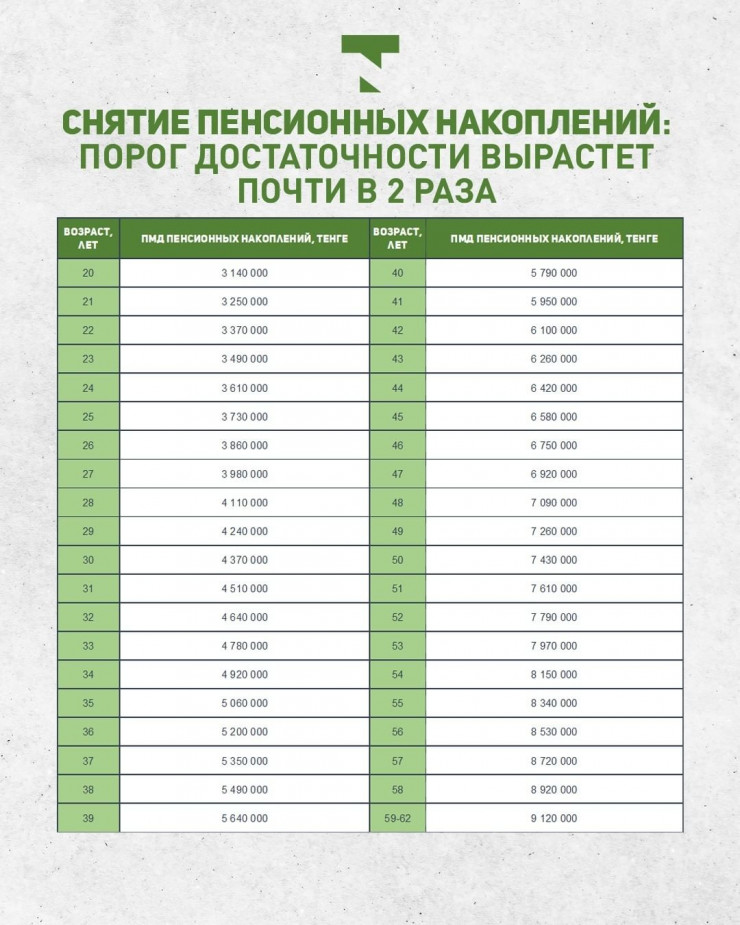 С 1 апреля порог достаточности увеличился почти в два раза. К примеру, для 20-летних порог достаточности составляет 3,1 миллиона тенге. До этого был 1,7 миллиона тенге. В 30 лет он составит 4,37 миллиона тенге, тогда как раньше был на уровне 2,5 миллиона тенге. Для 40-летних порог достаточности стал 5,79 миллиона тенге, ранее он был 3,42 миллиона тенге.