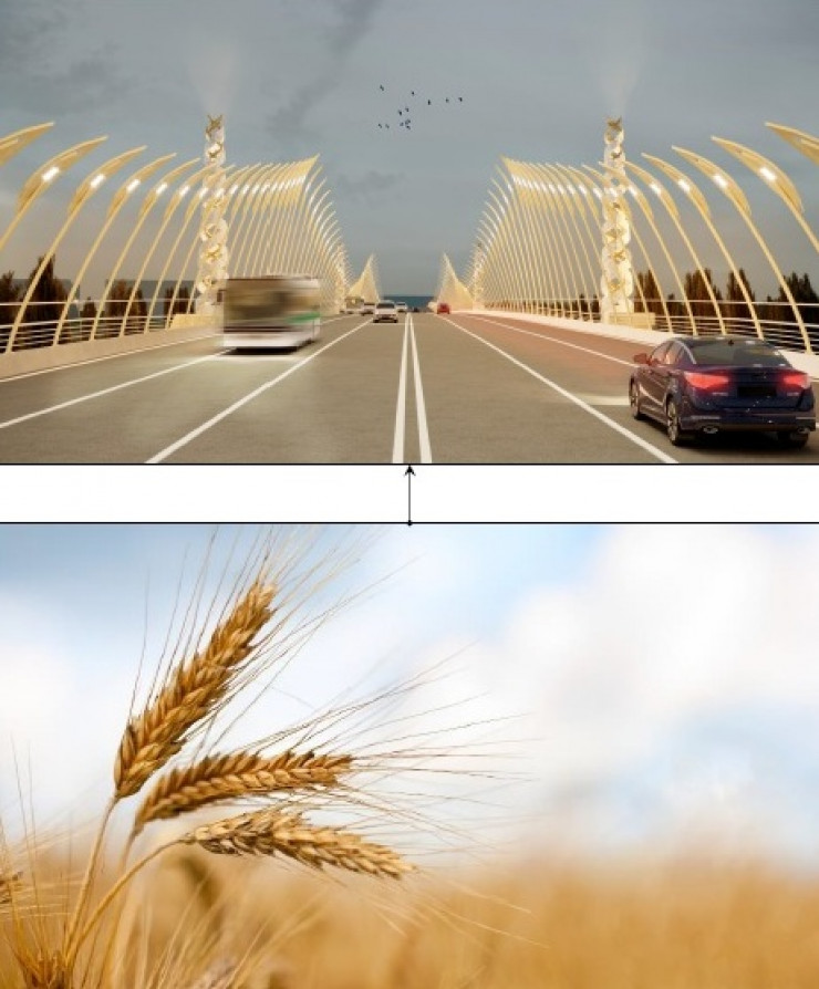 Фонари моста будут выполнены в виде колосьев. Общая композиция символизирует их колыхание на степном ветру.