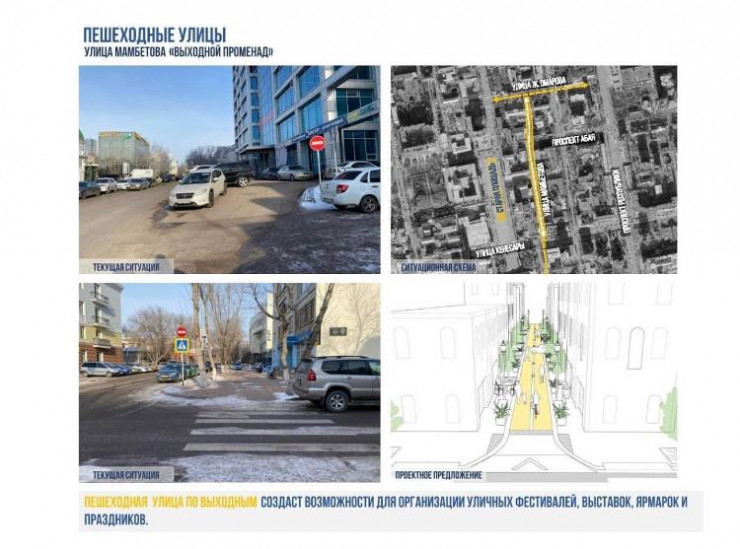 Улицу Азербайжана Мамбетова в Нур-Султане хотят сделать пешеходной по выходным дням в летнее время. В Управлении архитектуры, градостроительства и земельных отношений столицы показали эскизы планируемых изменений, передает Tengrinews.kz.