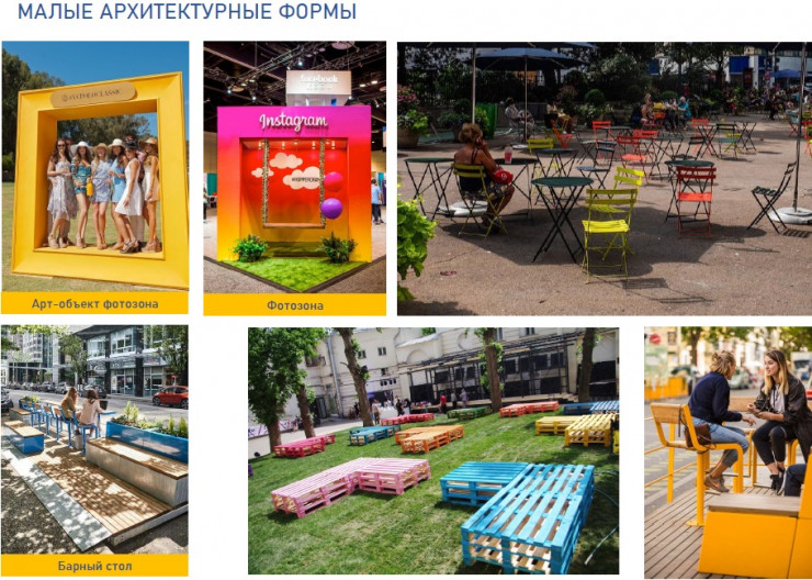Планируется установить необычные инсталляции, барные столы и организовать фотозоны из арт-объектов. Появится уличная мебель и малые архитектурные формы.