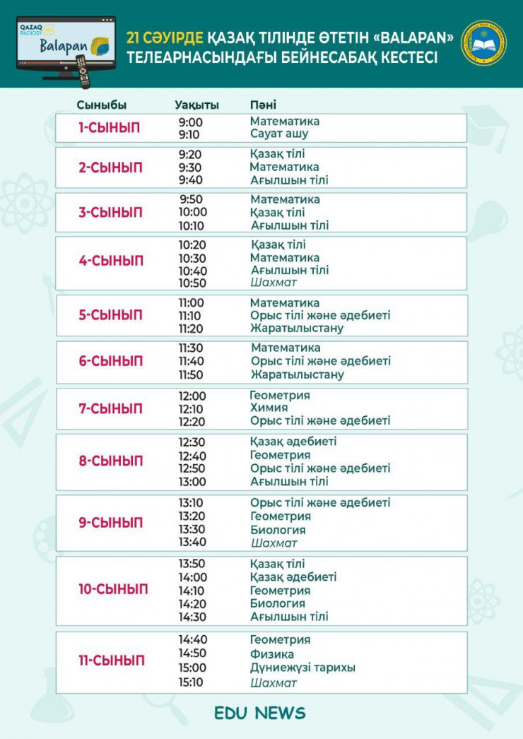Расписание телеуроков для 1-11-х классов с казахским языком обучения на телеканале "Балапан".