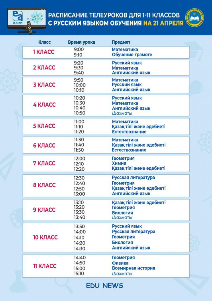 В Министерстве образования и науки озвучили расписание телеуроков для 1-11-х классов с русским языком обучения на 21 апреля, передает Tengrinews.kz.