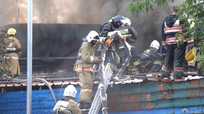 В то же утро алматинцы стали свидетелями еще одного крупного пожара: в Жетысуском районе загорелся склад. В нем хранилось около 200 тонн лакокрасочных изделий. Едкий черный дым был виден из самых отдаленных точек города. Для тушения пламени пришлось привлекать вертолеты. Однако даже с их помощью пожарным потребовалось семь часов, чтобы полностью локализовать пламя. Каждую минуту пожарные рисковали собой: центральная часть кровли здания разрушалась. Специалистам пришлось ее разобрать, чтобы получить доступ к внутренним помещениям здания.