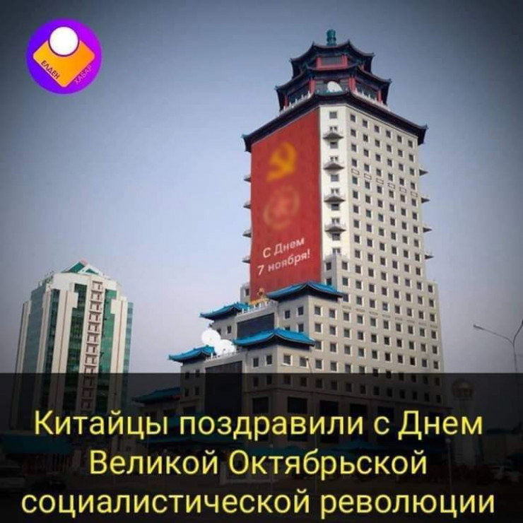 Автор снимка уверяет, что таким образом "китайцы поздравили с Днем Великой Октябрьской социалистической революции" народ Казахстана. На самом же деле такого баннера на здании нет, а фото обработано с помощью графических редакторов.