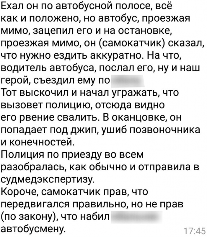 В комментариях один из пользователей рассказал, что все произошло после того, как автобус зацепил самокатчика, ехавшего по автобусной полосе. Между мужчинами произошла словесная перепалка, после чего водитель электросамоката залез в салон автобуса и набросился на оппонента с кулаками.