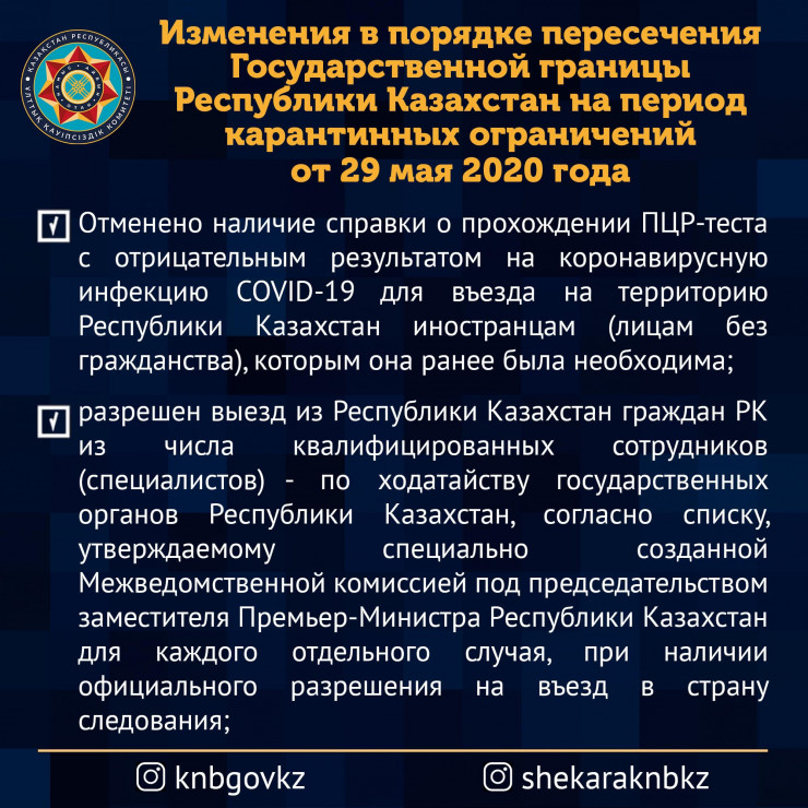 - Разрешен выезд из Казахстана гражданам из числа квалифицированных сотрудников по ходатайству государственных органов согласно списку специально созданной межведомственной комиссии. Каждый случай при этом рассматривается отдельно, обязательное условие - официальное разрешение на въезд в страну следования.