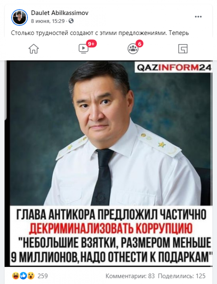 Казахстанцы обсуждают "новость" о том, что глава Антикоррупционной службы Марат Ахметжанов предложил декриминализовать взятки меньше девяти миллионов тенге. Их якобы следует считать подарками, передает Tengrinews.kz со ссылкой на Stopfake.kz.