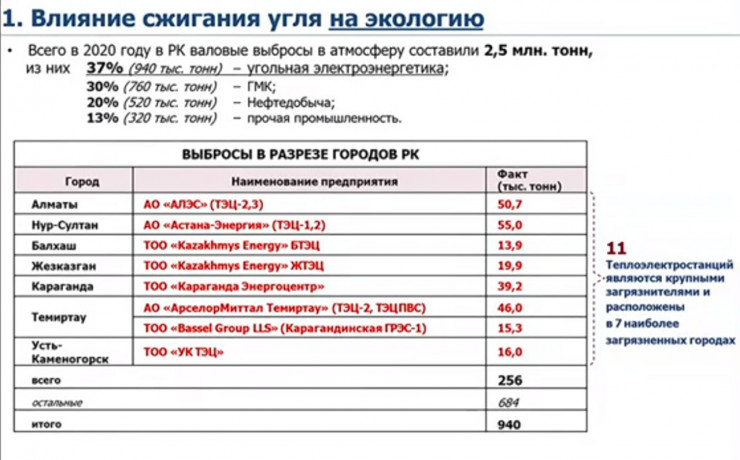 "В прошлом году в атмосферу промышленными предприятиями было выброшено 2,5 миллиона тонн загрязняющих веществ, 37 процентов, или более 900 тысяч из которых приходятся на угольные станции. Как известно, проблема качества атмосферного воздуха является характерной как для городов Нур-Султан и Алматы, так и ряда регионов. Индекс качества атмосферного воздуха в этих городах характеризуется высоким загрязнением по таким ингредиентам, как пыль и диоксид серы, что свойственно выбросам от угольных станций. В этих семи городах (указаны на изображении ниже. - Прим.) проживает более 4 миллионов человек, или порядка 25 процентов от общего населения страны", - сказал Магзум Мирзагалиев.