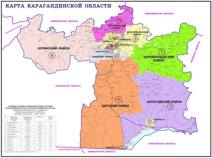 В Карагандинской области останутся города Караганда, Балхаш, Сарань, Темиртау, Шахтинск и Приозерск, а также семь районов: Абайский, Актогайский, Бухар-Жырауский, Каркаралинский, Нуринский, Осакаровский и Шетский.
