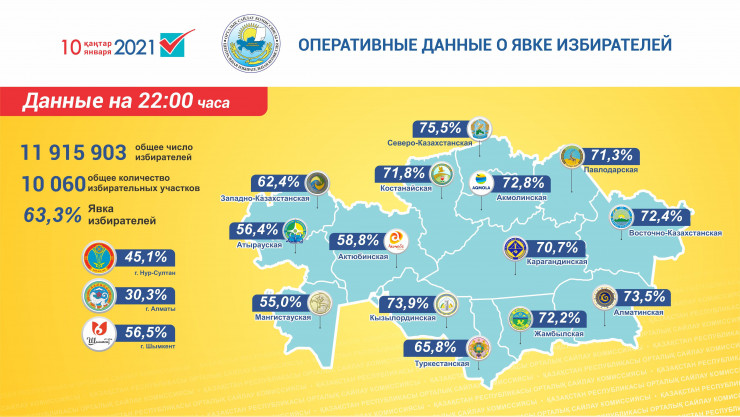 "Согласно оперативным данным, представленным областными избирательными комиссиями, городов республиканского значения, столицы, по состоянию на 22 часа времени столицы 10 января 2021 года, избирательные бюллетени получили 63,3 процента от общего количества избирателей, включенных в списки", - сообщил заместитель председателя Центральной избирательной комиссии Константин Петров.