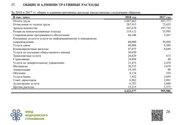 На официальном сайте депозитория РК валовая прибыль фонда на конец декабря составила 5 949 713 000 тенге, при этом общие и административные расходы составили 4 423 377 000 тенге (больше чем две трети доходов тратится на содержание самого фонда), из которых 3 047 663 000 тенге ушли только на оплату труда.