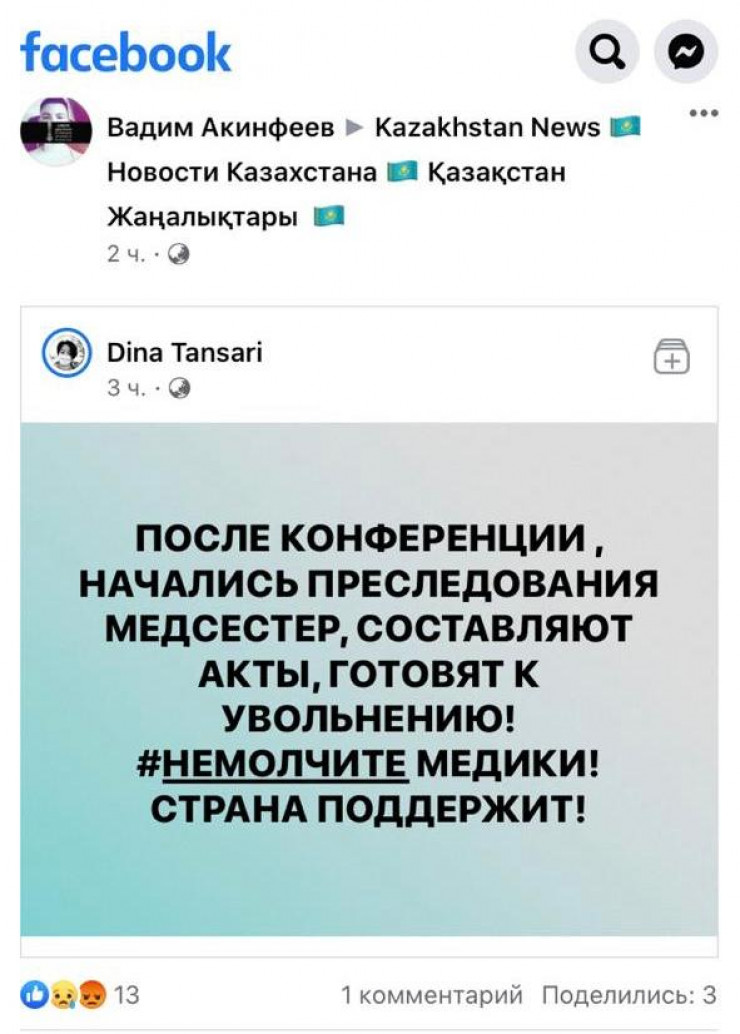 Речь идет о пресс-конференции с участием медсестер и других сотрудников местной больницы, которая ранее прошла в Туркестанской области. О ней тоже стало известно из публикации общественницы.