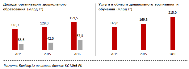 Основной объем услуг в области дошкольного образования оказывается за счет бюджета - 164,4 миллиарда тенге в 2016 году. Для сравнения, за счет населения услуг в секторе было оказано на 50,2 миллиарда тенге, предприятий - на 409,3 миллиона тенге.