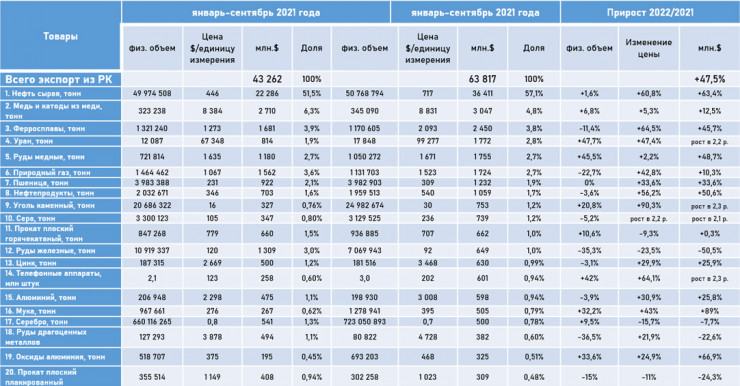 Казахстанский экспорт за январь-сентябрь 2022 года вырос на 47,5 процента, или на 20,5 миллиарда долларов, и составил 63,8 миллиарда долларов. Однако, по расчетам ERI, реальный рост экспорта Казахстана составляет порядка 2,8-3 процентов. Это означает, что текущее увеличение стало возможным за счет высоких цен на основные экспортные позиции.