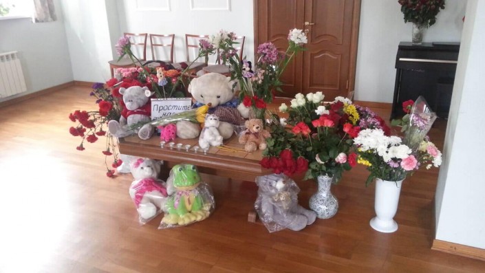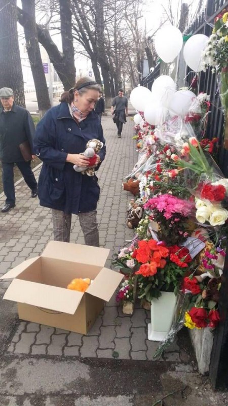 Митинг скорби у здания консульства прошел 28 марта 2018 года. Игрушки и цветы были принесены алматинцами в память о погибших при пожаре в торговом центре "Зимняя вишня" в Кемерово.