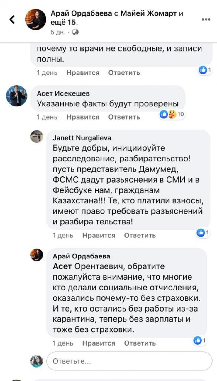 Кроме того, вопросом заинтересовался секретарь Совета Безопасности Казахстана Асет Исекешев. Он также обещал проверить факты о несуществующих записях в приложении Damumed. Об этом он написал в комментариях под постом жительницы Нур-Султана Арай Ордабаевой, которая в числе первых заявила о проблеме.