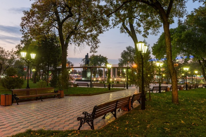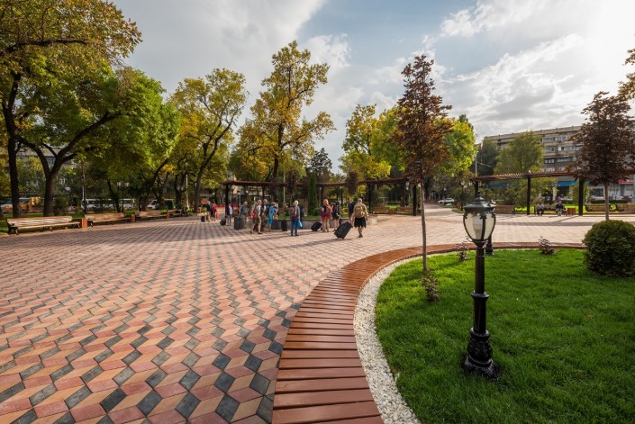Здесь уложили тротуарную плитку, расширили площадь озеленения и высадили более 40 деревьев. Также установили малые архитектурные формы, обновили облицовку памятника Алиби Жангильдину и установили камеры видеонаблюдения.