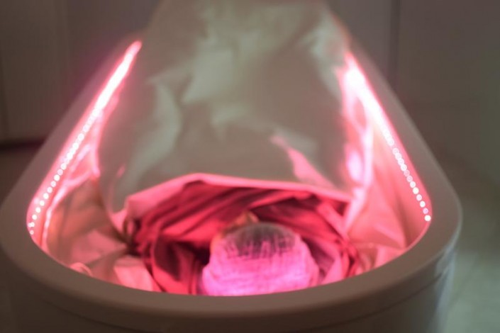 Но в то время как в кабинете ароматерапии клиент буквально мокнет под проливным дождем, в соседней комнате происходит не менее показательный ритуал обертывания, при темном свете, немного напоминающем совсем другую церемонию - погребения.